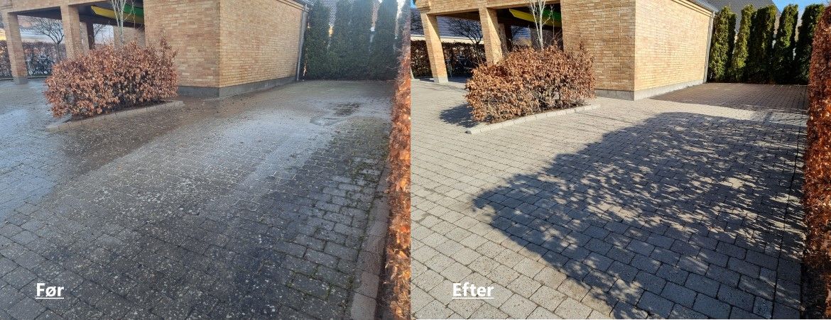 Her på siden ser du den forskel, en fliserens kan gøre for udtrykket på fliserne. Det resultat, du ser her på siden, er opnået med vores hedvandsanlæg. Fliserens med hedvandsrensning kommer dybt ned i sprækker og tager sig grundigt af overflader. Bagefter vil fliserne stå fantastisk og være klar til, at du og dine gæster kan hygge jer på terrassen.